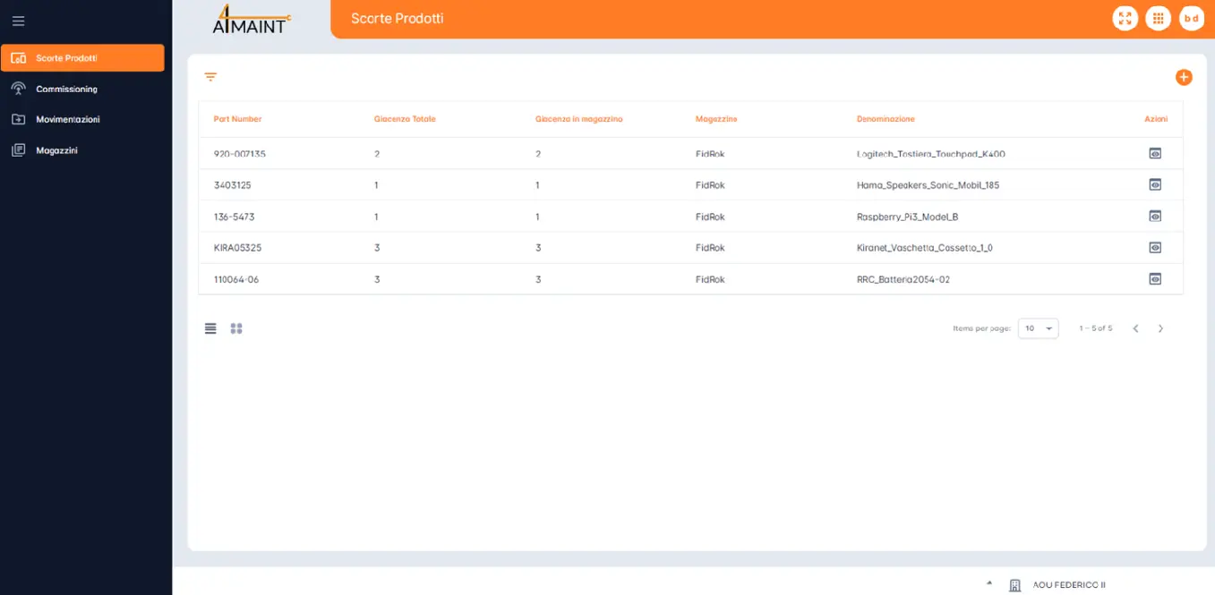 Il modulo AI4MAINT_SS gestisce i componenti di ricambio in modo efficace, garantendo tracciabilità, ottimizzazione scorte e sincronizzazione automatica tra sedi, per assicurare disponibilità continua.